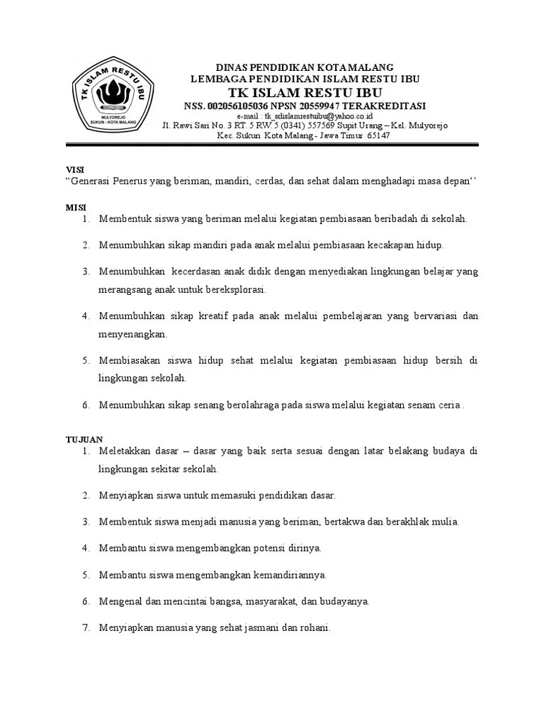 Terwujudnya sekolah yang melahirkan generasi cerdas yang religius, berakhlakul karimah, dan berwawasan global. Mengembangkan pola pembinaan generasi emas yang berakhlak islami . Visi dan misi tk · visi dan misi tk · visi misi tk pertiwi kota medan · visi: Visi & misi kb/tk islam pangeran diponegoro · menanamkan pondasi yang kuat dan kokoh pada anak usia dini untuk proses pembentukan kepribadian sesuai aqidah islam . · mempersiapkan anak didik menjadi generasi yang cerdas, sehat ceria, berakhlak mulia, . Terwujudnya lembaga pendidikan islam yang berkualitas dan berbasis pada penguasaan hafalanal qur'an, ilmu syar'iyyah, didukung dengan pengenalan . Visi & misi · 1. Menjadi lembaga pendidikan paud (tk ) islam terpadu bagi anak usia dini pada semua lapisan masyarakat kota dan kabupaten magelang . Menjadi lembaga pendidikan pra sekolah islam dengan kekhasan karakter yang unggul, mandiri dan kreatif. Mewujudkan generasi sukses dunia akhirat · misi: " mewujudkan generasi muslim yang berakhlak mulia, mandiri,trampil,cerdas, dan kreatif ".